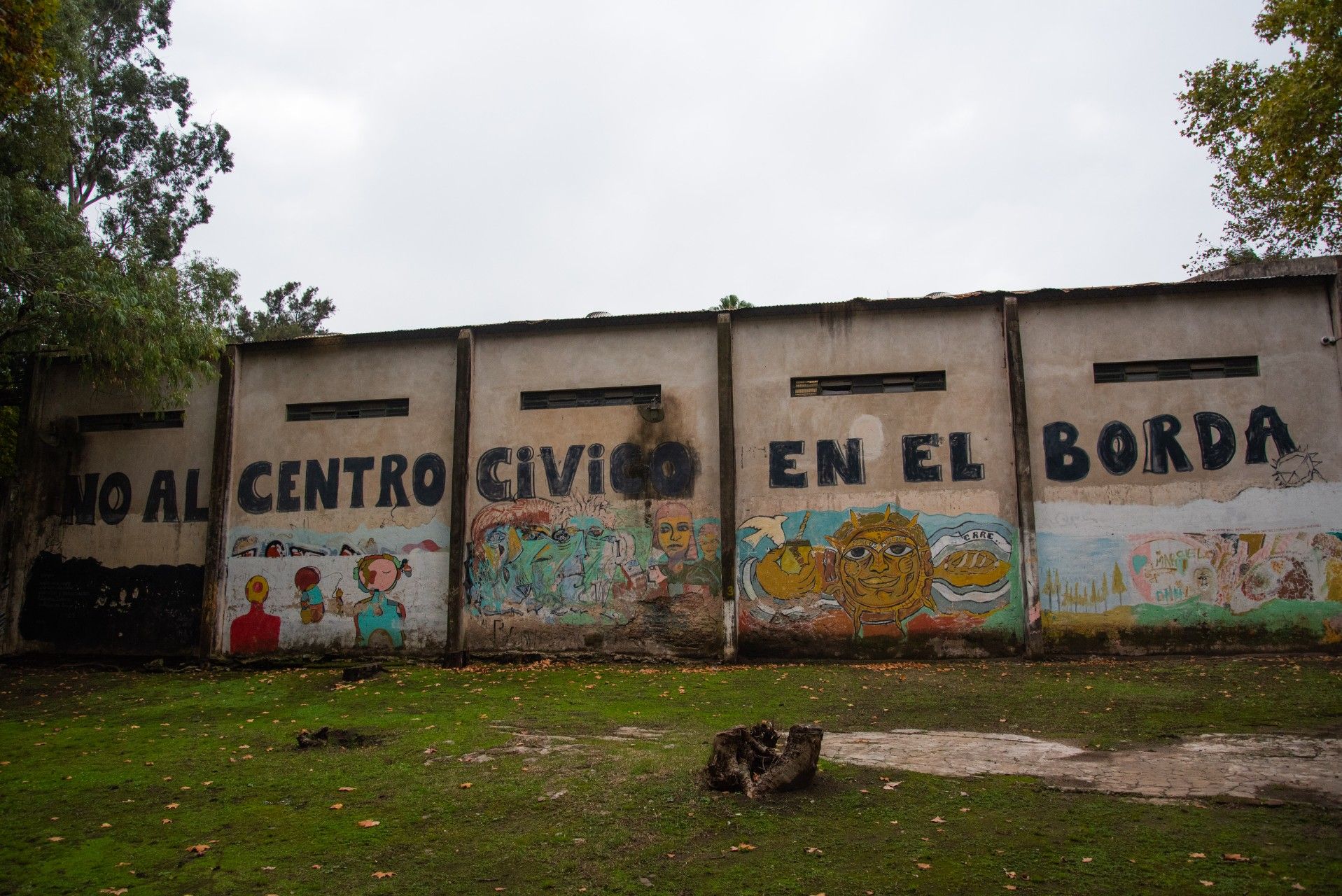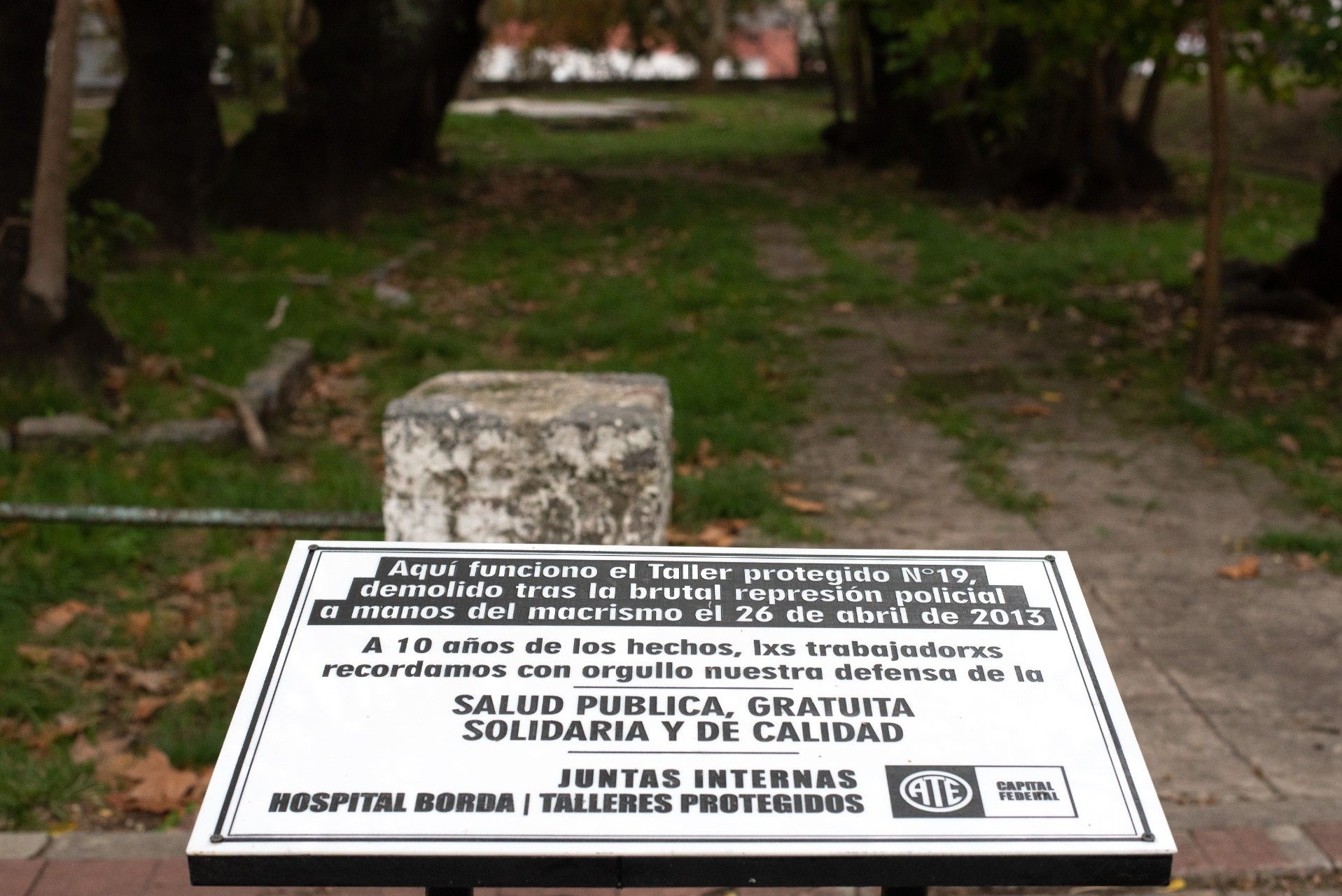 Delante de la cancha de fútbol y de esa hilera de plátanos que diseñan una postal bucólica de fondo de pantalla, se ven unas ruinas y un cartel que dice: “Aquí funcionó el Taller Protegido Nº 19, demolido tras la brutal represión policial a manos del macrismo el 26 de abril de 2013”. Es un cartel de la Asociación de Trabajadores del Estado (ATE) que la comisión interna del Borda acaba de poner. Es un recuerdo de una defensa: donde el entonces jefe de Gobierno porteño, Mauricio Macri, quería hacer un “desarrollo urbano”, ahora hay internos que hablan y que posan para una foto.